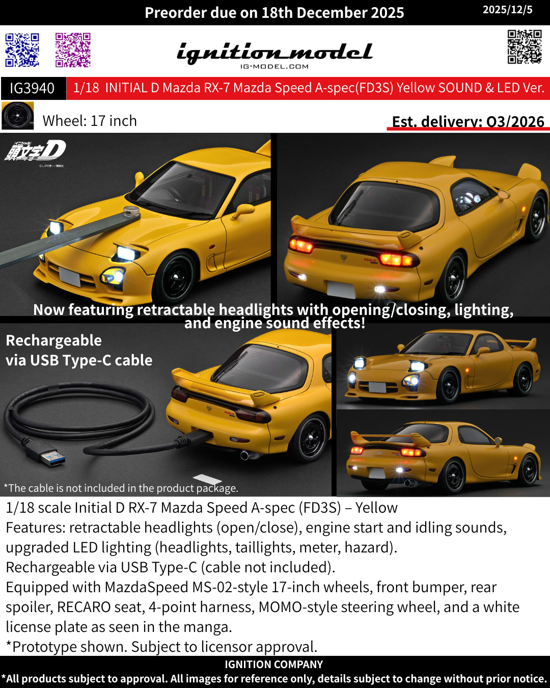 Description: Brand: Ignition Model Item No.: IG3940 Item: Nismo INITIAL D Mazda RX-7 Mazda Speed A-spec(FD3S) Yellow Sound & LED Ver. Scale: 1/18 Material: Resin Color: Yellow 這款1/18比例的樹脂模型忠實還原了漫畫《頭文字D》第17卷中高橋圭介駕駛的馬自達TRX-7 Speed A-spec (FD3S)。 此版本再現了高橋圭介在「D計畫」初期與ER34首次交鋒時駕駛的RX-7。 這款高級機型新增了諸多機關,例如可開啟的伸縮式頭燈以及逼真的引擎啟動和怠速音效。 油箱蓋同時也是電源開關-按下即可開啟模型。滑動引擎蓋尖端附近的磁棒即可打開頭燈罩。 輕觸引擎蓋上的噴嘴區域即可啟動引擎音效和怠速效果。 注意:即使斷電,也可以透過磁棒打開或關閉頭燈罩。 與之前的模型一樣,這款模型也配備了LED燈——亮度更高。 用磁性棒輕觸引擎蓋前部即可啟動頭燈、尾燈、倒車燈和儀錶板。再次輕觸會觸發危險警告燈閃爍,第三次輕觸則會關閉所有燈光。 充電透過 USB Type-C 介面進行,該介面可透過取下磁吸式後牌照架找到。建議充電約 15 分鐘。 (USB 數據線需另行準備。) 該車配備 MazdaSpeed MS-02 款式的 17 吋輪圈(拋光黑色),車身降低,並配有 MazdaSpeed 前保險桿、後擾流板、紅色煞車卡鉗、大口徑排氣管、RECARO 桶形座椅、四點式安全帶和 MOMO 款式方向盤。 車牌採用漫畫中出現的「白色」設計。 本模型基於真實車輛的全3D掃描數據,並由官方授權方「講談社」進行嚴格審核和監督,以確保外觀和內裝細節的精準還原。 包裝盒採用印有漫畫場景的背景圖案,作為《頭文字D》30週年紀念限定版發售。 TRX-7 Mazda Speed A-spec (FD3S), as driven by Keisuke Takahashi in Volume 17 of the manga Initial D, faithfully reproduced in 1/18 scale using resin material. This version recreates the RX-7 featured in Keisuke’s first battle against the ER34 during the early stages of Project D. This premium model introduces new gimmicks, including openable retractable headlights and realistic engine start-up and idling sounds. The fuel cap serves as the power switch—pressing it turns the model ON. By sliding the included magnetic stick near the tip of the hood, the headlight covers open. Tapping the washer nozzle area of the hood activates the engine sound and idling effect. Note: The headlight covers can be opened or closed via magnetic stick even when the power is OFF. As with previous models, LED lighting is included—now with increased brightness. Touching the front of the hood with the magnetic stick activates the headlights, taillights, reverse lights, and meter panel. A second touch triggers hazard light blinking, and a third touch turns all lights off. Charging is done via a USB Type-C port, accessible by removing the magnetically attached rear license plate. Approx. 15 minutes of charging is recommended. (USB cable not included—please prepare one separately.) The car is equipped with MazdaSpeed MS-02-style 17-inch wheels (polished & black) with a lowered stance, MazdaSpeed front bumper, rear spoiler, red brake calipers, large-diameter muffler, RECARO bucket seats, 4-point harness, and MOMO-style steering wheel. The license plate replicates the “white” design seen in the manga. Based on full 3D scans of the real vehicle, this model has been carefully reviewed and supervised by the official license holder "Kodansha" to ensure accuracy in both exterior and interior details. The packaging features a printed backdrop depicting a manga scene and is released as a 30th Anniversary Limited Edition of Initial D. *Reference image only, details subject to change according to licensor approval. Retail Price 價格:3070.00 港元(HKD) RC-MODEL -———————————————— Online Store” : https://rcmodel.boutir.com/ 門市 : 旺角 廣華街1號 仁安大廈(潮流地域) 地下G6B-G15舖