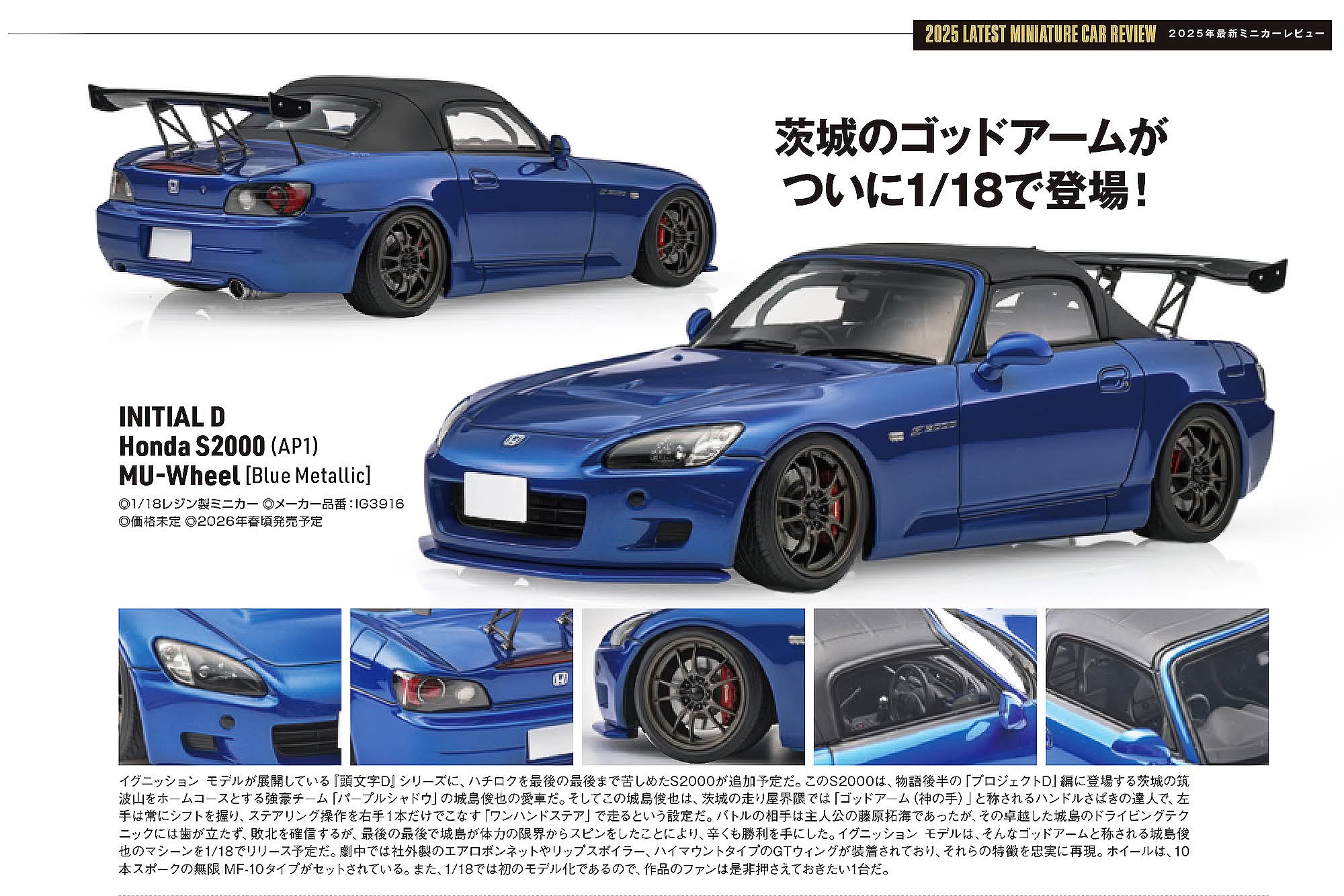 * 隨車贈送IG專用 亞加力高清展示盒 Description: Brand: Ignition Model Item No.: IG3916 Item: INITIAL D Honda S2000 (AP1) Material: Resin Color: Blue Metallic Feature: The “S2000 (AP1)” driven by Toshiya Jojima in the manga “Initial D,” faithfully reproduced in 1/18 scale. Body color: Blue metallic. Fitted with MUGEN MF10-style 17-inch wheels (bronze) and a lowered stance. Key features include OEM aero parts (front lip spoiler, side skirts), GT wing, red brake calipers, single muffler, and an interior featuring black RECARO seats, 6-point roll cage, and MOMO-style steering wheel. *Reference image only, details subject to change according to licensor approval. Retail Price 價格:2460.00 港元(HKD) Est. Launched Date: Q2 2026 RC-MODEL ---------------------------------------- Address: G6B-G6D ON G/F Young City No.1 Kwong Wa Street , Mong Kok 旺角 廣華街1號 仁安大廈(潮流地域) 地下G6B-G6D舖 Online Store: https://rcmodel.boutir.com Payment: 💰: 門市付款/ 銀行轉賬/ 八逹通/ FPS/ PayMe/ VISA/Masetercard/ 銀聯/ 支付寶/ 微信支付/ *支持消費劵💰 Welcome for inquiry and orders. 歡迎查詢及訂購 💬Store/Wtapp/PM https://api.whatsapp.com/send?phone=85269286087