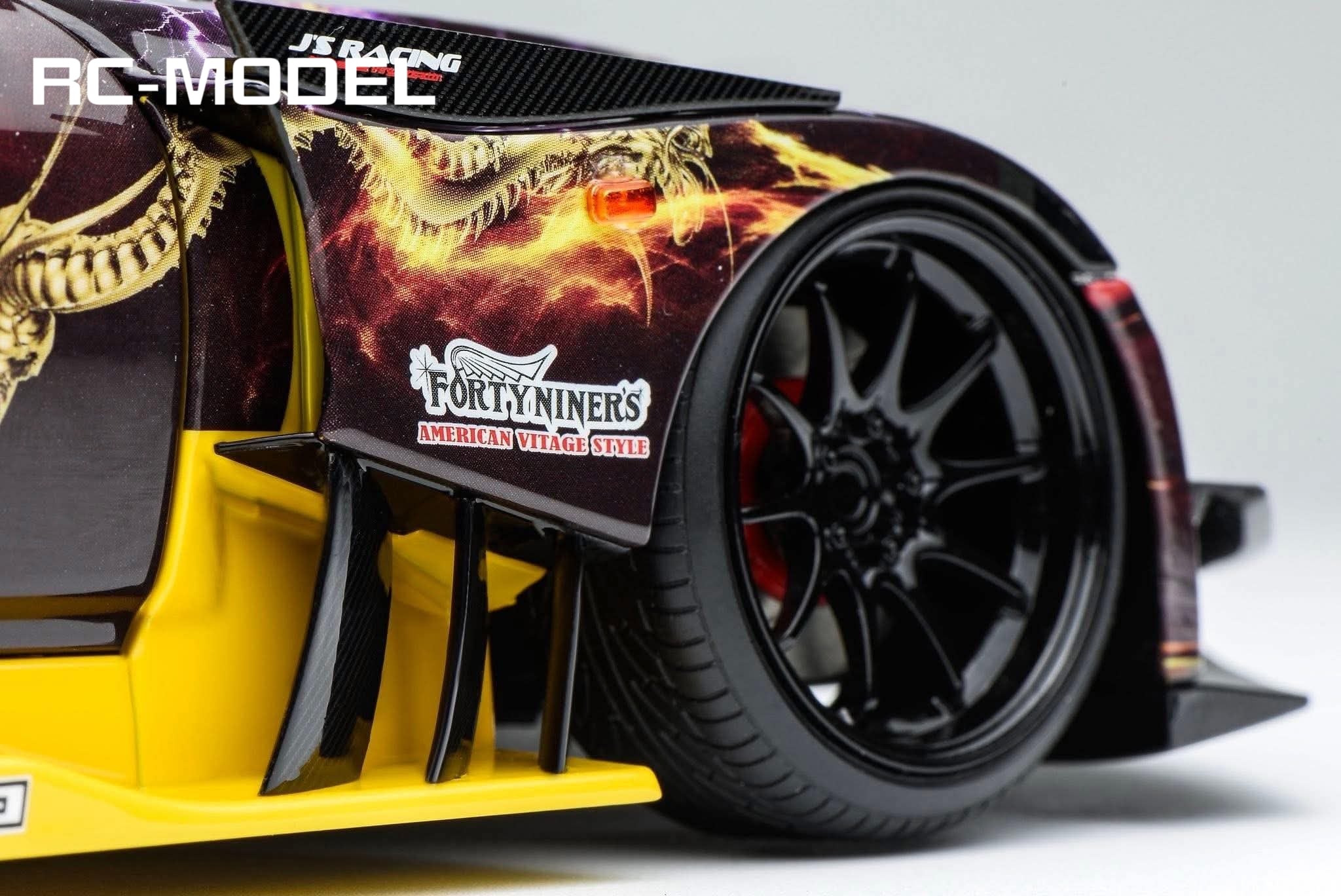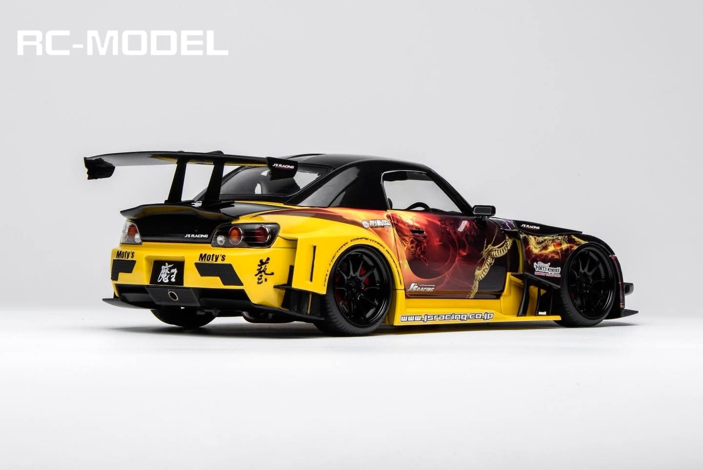 The model highly replicates the real car, with a full body clear coat finish and a comprehensive high-definition reproduction of the "Maou Dragon Pattern" livery. The model features opening doors and hood, and the steering wheel turns with the front wheels. The J's Racing Type-GT Wide Body Aero System, 18-inch RAYS wheels and customized parts, and carbon fiber canards with "J's Racing" logos on the front fenders are all accurately reproduced, showcasing a powerful and impressive design. This perfect replica of a legendary car boasts both performance and stunning aesthetics. Packaging includes: high-density foam box + color box packaging, with a dedicated door opener, certificate, and manual. Officially licensed by both HONDA and J's Racing.